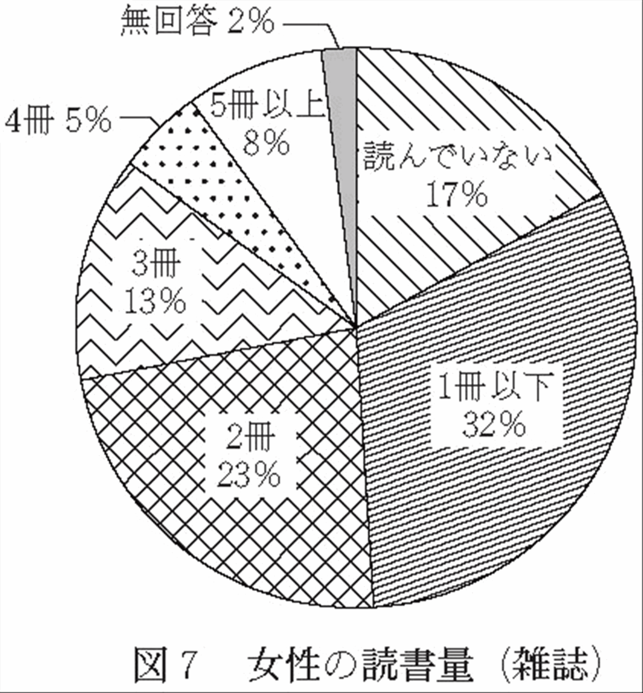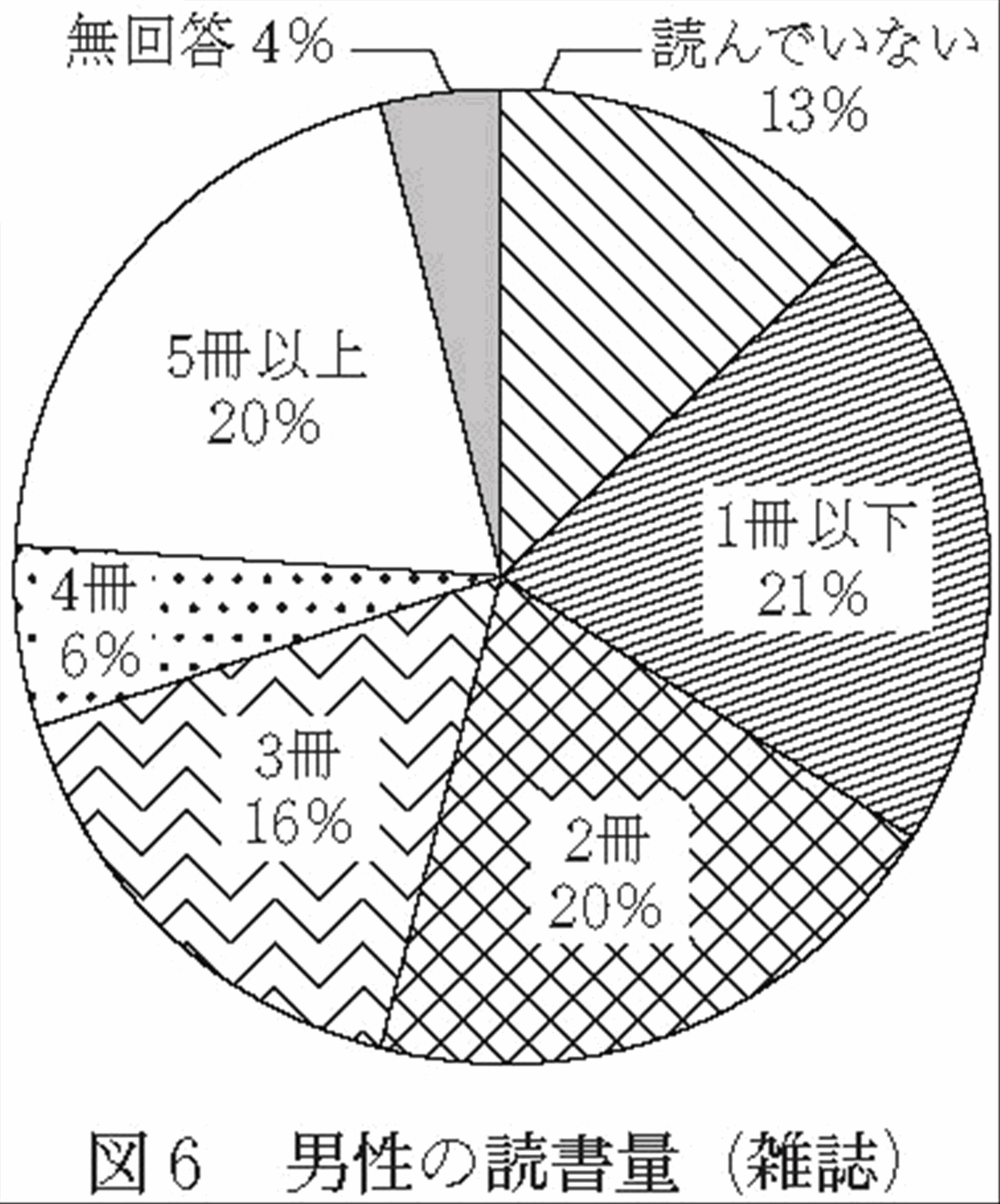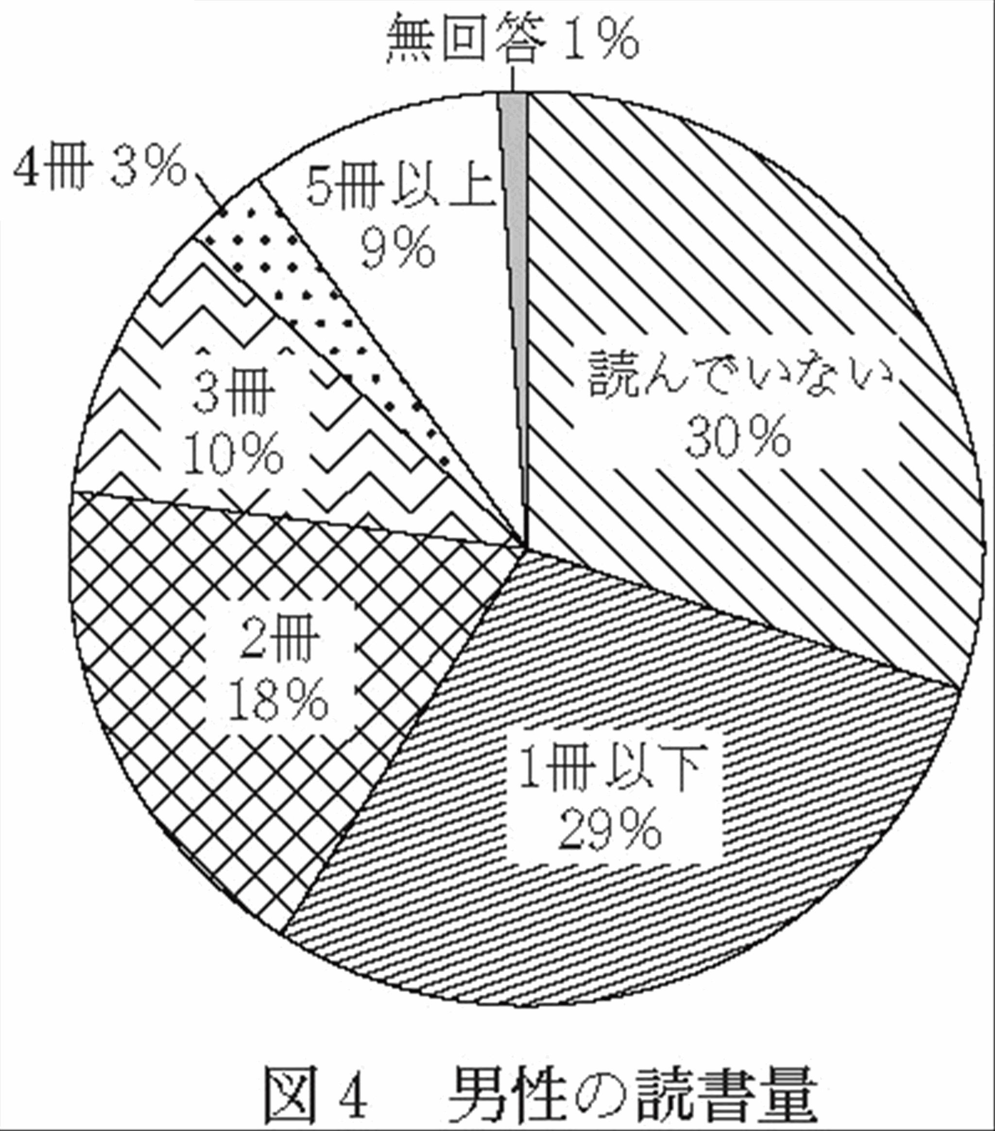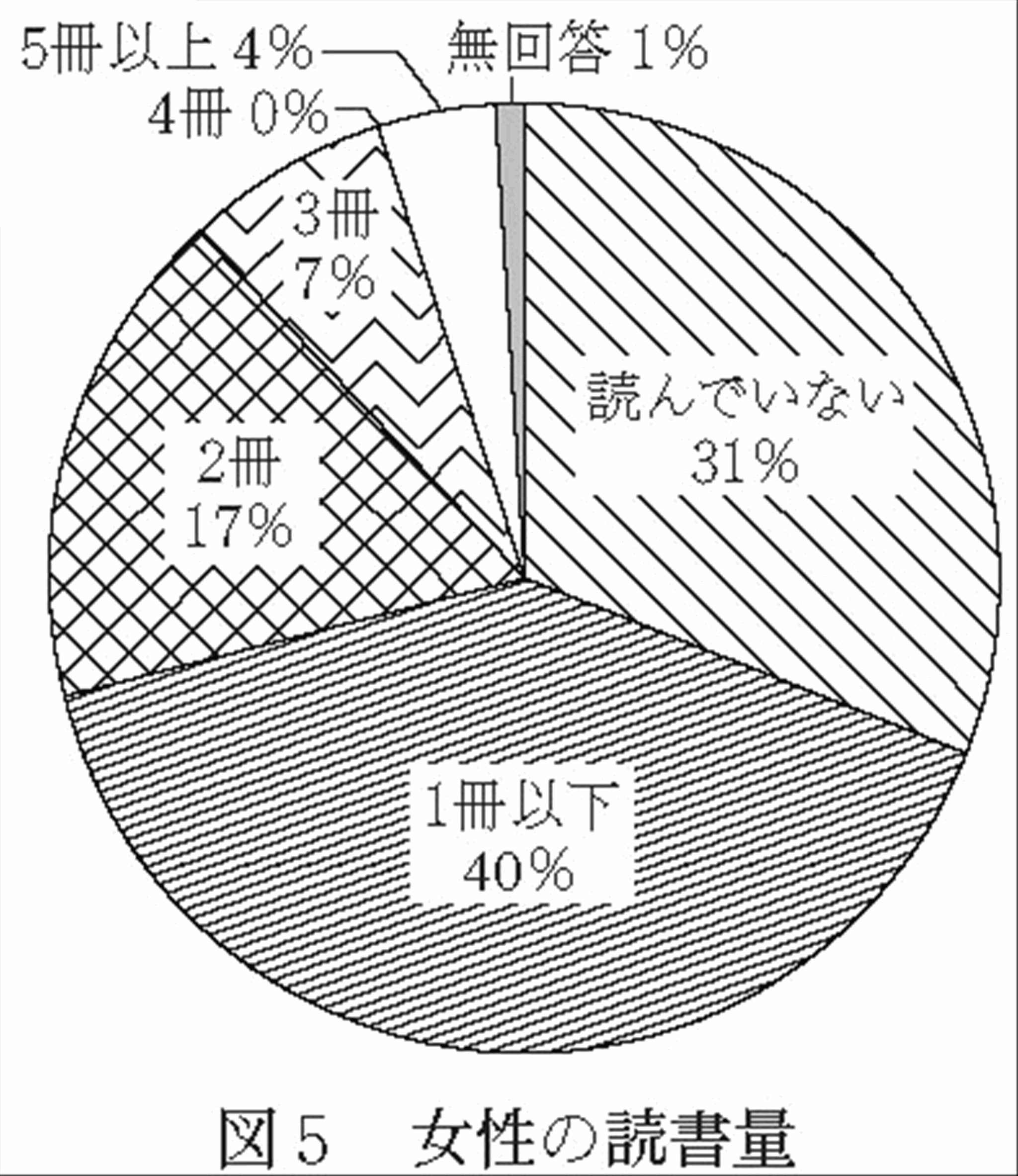 問2.(1か月の平均読書量)あなたは、1か月に平均何冊本を読みますか(雑誌、漫画は除く) 分析:男女ともに、1か月に幾らかでも読書するとした回答が7割を占めている(図4、5)。しかし、その中で1冊以下とする回答が約半数を占めており、量的に多いとは言えない。これも、過去の調査と同様の結果であり、穴吹町民の読書意欲が格別低いとは言い得ない。