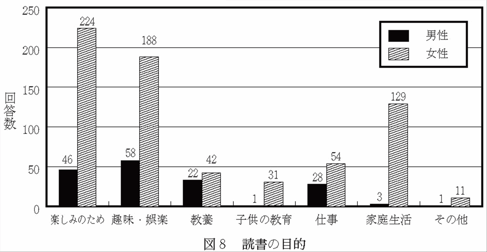 問4.(読書の目的)あなたはどんな目的で本や雑誌を読みますか。(主なもの2つに○を) その他の回答:ひまつぶし(2). 分析:男性は、趣味・娯楽のため、楽しみのため、仕事のため、と続くのに対して、女性は、楽しみのため、趣味・娯楽のため、家庭生活のためとなっている(図8)。特に女性の回答者のうち家庭生活のためと答えた人は30%に達するのに対し、男性の回答者は3%にとどまるなど、男女の読書傾向の顕著な特徴にもなっている。