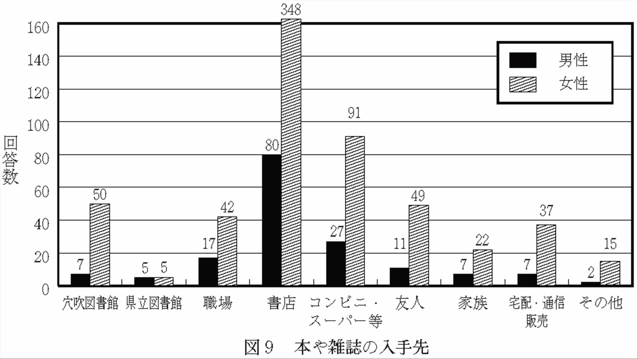 6.まとめ(読書と図書館の関わりについて) ここ数年の読書調査は、まったく偶然であるが図書館を設置している自治体を対象にしており、那賀川町、北島町、日和佐町、井川町、穴吹町と続いてきた。 もとより読書は、公共図書館だけが関わっているわけではない。また、読書調査の対象者は地域住民全般ではなく、小・中学校の児童生徒およびその保護者である。当然、地域全住民の総意ではなく、限定された一部の意見である。そのことを前提として、地域住民の読書と公共図書館との関わり方について考察してみたい。 徳島県下の図書館設置状況は50市町村のうち26で(設置率52%)、約半数の自治体が図書館を設置している。その大半は県立図書館が文化の森への移転を計画していた昭和60年(1985)以後に建設した所が多い。図書館を設置している自治体の住民にとって、読書や図書の入手経路に変化があるのか、あるいは図書館がどの程度住民に利用されているのか、様々な興味をもって調査に臨んだ。 これまでの調査で、図書の入手経路は、公共図書館よりむしろ書店や学校などと深い関わりがあることが判明している。入手経路で「書店から」と回答したのは、過去数年の調査では、那賀川町90.0%、北島町84.5%、日和佐町82.1%、井川町83.3%、穴吹町84.0%と圧倒的に多い(複数回答あり)。これに対して「図書館から」を挙げたのは、那賀川町16.9%、北島町45.6%、日和佐町34.4%、井川町30.8%、穴吹町11.2%であった。現在の利用状況から考えると那賀川町の場合、入手経路の「図書館から」の数字が低いことが意外である。これは調査時期が町立図書館開設直後であったことが原因と考えられ、現時点で調査すればおそらく北島町を上回るのではないかと推測できる。 調査の結果、図書館を設置している自治体であっても、図書の入手経路は「書店から」の回答が圧倒的に多く(平均84.8%)、住民の読書に関して書店の果たす役割の大きさがうかがわれる。しかし、「図書館から」の回答については一定でなく、それぞれ地域の実情によってかなり格差がみられた。 ところで穴吹町は昭和62年(1987)に役場庁舎を新築したが、その際、庁舎2階に公民館とともに町立図書館を開館させた。県内の自治体としては11番目の設置である。他町村に先駆けて早い時期に図書館を設置したことは、町民はもちろんのこと、県内外の図書館関係者から歓迎された。 ただ、開館当初から懸念されていたこともある。立地場所が役場庁舎の2階に位置しており、日常的に利用しやすい施設ではないこと、町の中心街からやや離れていること、国道(192号線)を横断する必要があり、幼児や高齢者には少し危険を伴うこと、等々が図書館の利用に悪影響を与えるのではないかと思われていた。 穴吹町立図書館は開館後10年を経過したが、町民の利用は低調で、利用状況は横ばいか、むしろ減少気味である。たとえば、平成9年(1997)度の貸出冊数は7,526冊である。県下で最も利用の多い那賀川町立図書館では278,726冊、次いで藍住町立図書館184,469冊、北島町立図書館181,647冊であった。しかし、貸出冊数だけの比較は、自治体ごとの人口数が異なるのであまり意味がない。そこで図書館界では、利用状況の指標として、人口一人当たりの貸出冊数を使うのが一般的である。平成5年(1993)に徳島県教育委員会が作成した『徳島県市町村立図書館振興計画報告書』によると、「住民一人あたりの貸し出し冊数は少なくても4冊以上、できればその倍の8冊以上を目指していきたい」とある。穴吹町の場合、人口が8,053人(平成9年)なので、一人当たりの貸出冊数は0.93であった。県下の市町村立図書館で利用度の高い順では、那賀川町立図書館の25.8、牟岐町立図書館12.6、羽ノ浦町立図書館9.99、川島町立図書館9.96、海南町立図書館9.43、北島町立図書館9.11と続いている。ちなみに県下の町村立図書館20館の平均は6.68である。 これらの結果から見ても、穴吹町立図書館の利用は必ずしも活発とはいえない。上記のように物理的に利用を阻害する側面もあるので、このままで図書館の利用が増加するとは考えにくい。しかし、町の文化の中心施設として、さらに生涯学習の拠点として、多くの町民から期待されていることも事実である(アンケートや座談会での住民の意見などから)。 図書館の発展のためには、当然、予算や職員数なども考慮すべきであり、また、学校や公民館、社会教育団体などとの連携も必要であろう。さらに、町の総合計画の一環に図書館を位置付けられることも望みたい。将来の飛躍の可能性を含んだ穴吹町立図書館の今後の活動を見守りたい。