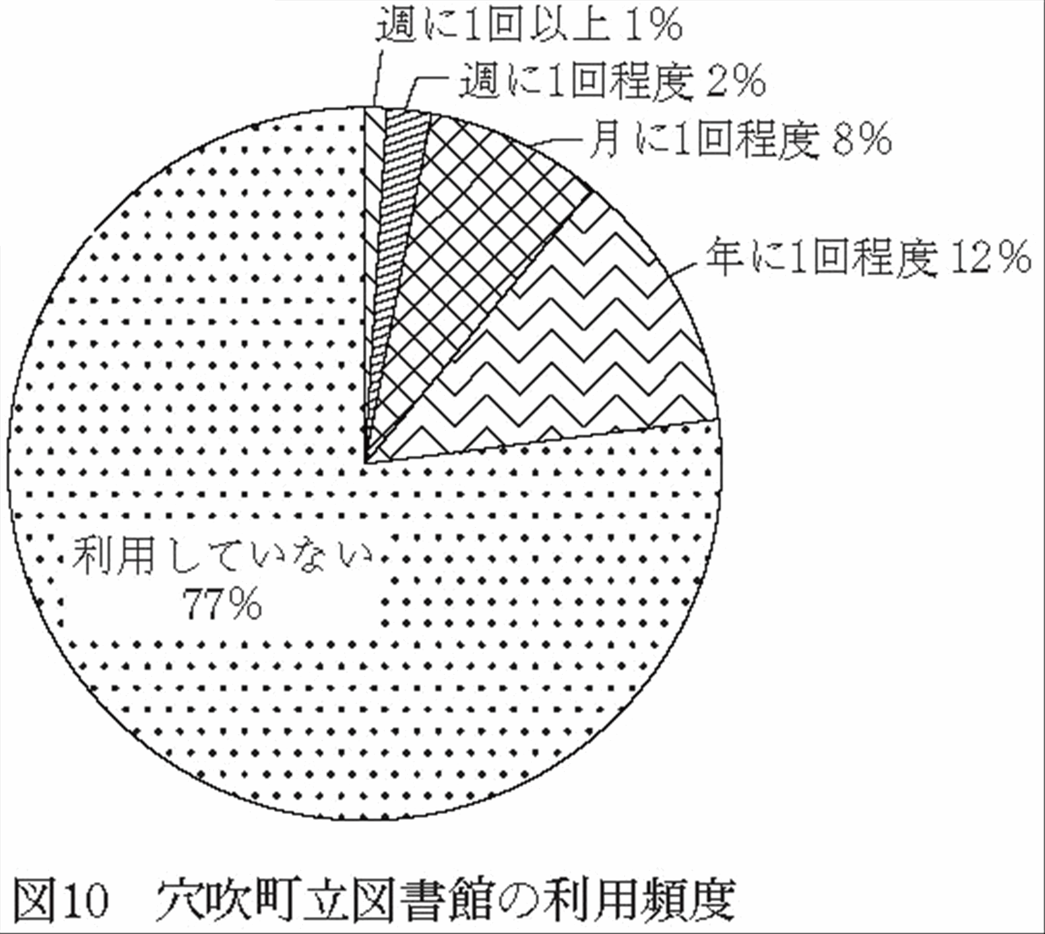 問11.穴吹町立図書館や県立図書館への希望があればなんでも書いてください。 分析:多くの意見・希望がよせられ、穴吹町での図書館に対する期待が大きいことがわかる。この期待に背くことのないよう、一層の努力と配慮が求められる。また、すでに実施されていると思われるサービスも希望されており、広報の重要性が再認識させられる。以下、分野ごとにまとめながら、解説したい。 ・休館日および開館時間について 開館時間延長(3).休館日が多すぎる(3).土、日、祝日に利用できるように(2).学校が休みの多い月・火曜日が休みなので他の日を休みにしてほしい. 休館日を減らしたり、開館時間を延長するためには、職員増が不可欠であり、簡単ではないかもしれない。町としての、教育・文化行政への取り組みの度合いを示すものともいえるであろう。 ・資料について もっと新しい本を入れてほしい(9).ビデオ・CDの貸出(2).音楽関係の雑誌を置いてほしい(2).教育関係の本がもっとほしい.趣味や娯楽のための専門書などを多く置いてほしい.童話・絵本の数を増やしてほしい. 穴吹町立図書館の資料費を、全国の同じ人口規模の町村立図書館と比較すると、平均を大きく割り込むというほどではない。むろん、全国の平均値があまりにも低いためではあるが、選書傾向などを見直す必要があるのではないだろうか。 ・施設環境について 役場の中になければ利用したい(8).子供を連れても気楽に出入りできる環境を(2).コンピュータを導入して検索して本が選べるようにしてほしい(2).図書館内の飲食はやめてほしい(2).入館したときにじろじろ見られることがある.学生がうるさい. 『日本の図書館1998』(日本図書館協会刊)によると、穴吹町立図書館は資料の検索・貸出用にコンピュータを導入しているため、利用者用検索端末を導入することは可能なはずである。騒がしい利用者や図書館内での飲食は、職員がこまめに注意し、図書館の利用マナーの周知を徹底する必要がある。役場の2階という設置場所への反発が多いが、これは早急に解決することは困難であろう。が、図書館までの動線ルートの改善や休日の入口をより明確にすることなどが求められる。 ・サービス、職員について 本のあるなし、ないならいつ戻るか等にきちんと答えられる職員を配置してほしい、職員の方はもう少し明るく対応してほしいなど(4).もっと本の整理をしてほしい(3).新刊図書の紹介をしてほしい(2).1回に5冊位借りられるように.2週間くらい借りられるように.週刊誌・月刊誌・季刊誌等の前の分も見えるように並べてほしい.移動図書館を利用したい. 穴吹町は山間部等の利用の困難な地区をもつ町であるため、分館の設置が困難であるならば、移動図書館の導入は、大きな利便性の向上になるであろう。職員の勤務態度への意見が幾つかあるが、これも図書館への期待の大きさの反映と謙虚に受け止めてほしい。 ・県立図書館について 県立図書館で借りた本を町立図書館に返却できたらいい(2).県立は遠すぎる. 現在、県立図書館に分館の設置計画はない。県立図書館の分館網という考えは、現在の図書館界の主流ではなく、それよりも、図書館協力網の充実が主たる論調となっている。県立図書館の情報は、県立二十一世紀館の提供する学術情報検索システム