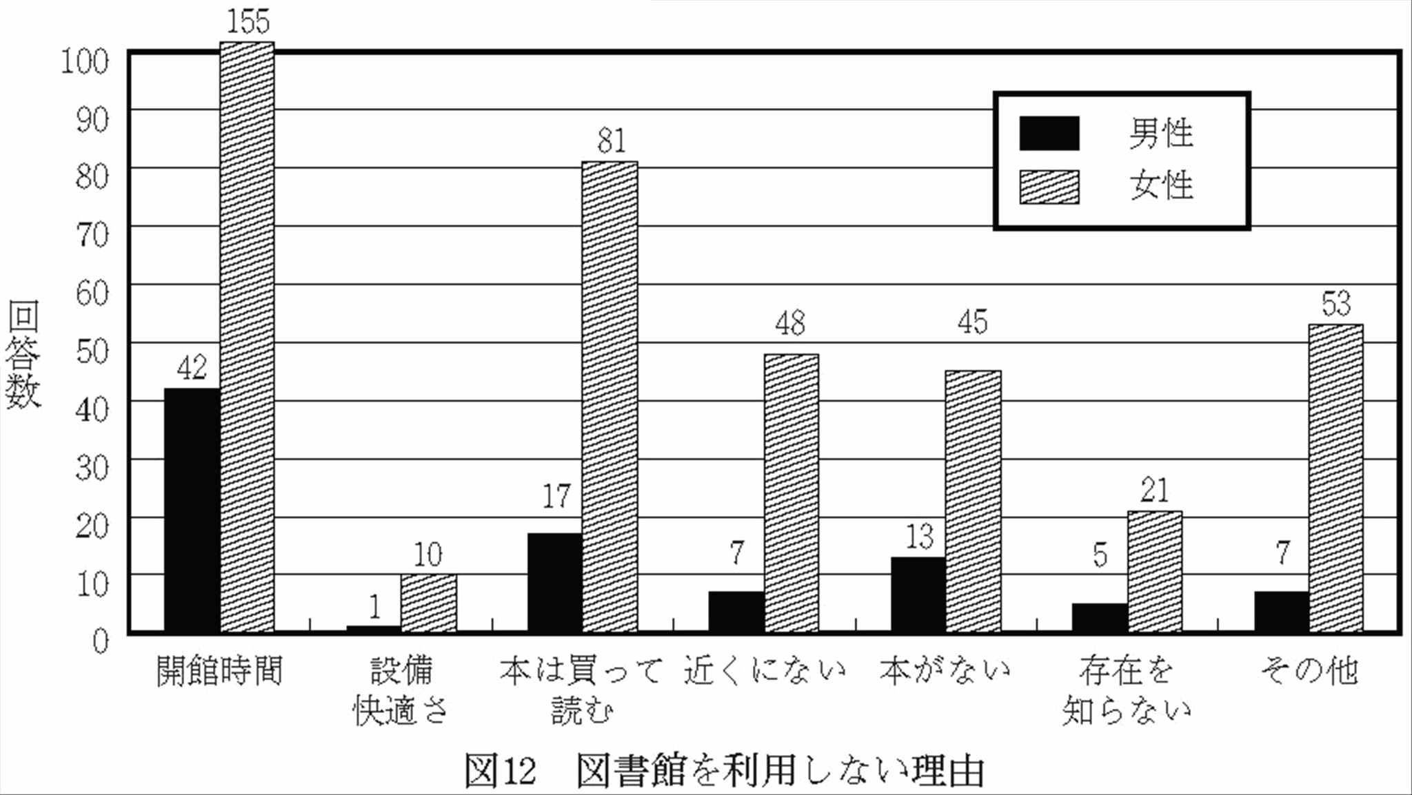 問8.(図書館を利用しない理由)(問6で「ない」と答えた人に)どのような理由で図書館を利用しないのですか(主なもの2つまで○を) その他の回答:めんどうくさい・時間がない(12).本を読む時間がない(11).休日に入り口がわからない・利用しにくい(6).子どもが小さいので(4).他の図書館を主に利用している(2).休館日が多すぎる.読みたい本がない.友人が借りた後貸してくれる.通信販売で買っている.家でゆっくり読みたい. 分析:男女ともに、開館時間中に利用できないとした人が最も多く、ついで、本は買って読む、近くにない、本がないと続いている(図12)。これらは、おおむね他の図書館にも共通した問題であるが、穴吹町の場合、利用していないと答えた人も多いので、さらに迅速な対応が求められる。さらに、その他の回答の中に見られる利用のしにくさ(開館時間が分からない、入り口が分からない、入りにくい)などは、より深刻な問題として受け止められるべきであろう。