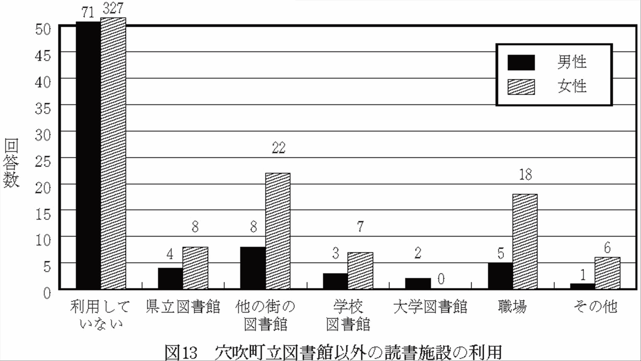 問9.(他の読書施設の利用)あなたは、穴吹町立図書館以外の読書施設を利用していますか 他の町の図書館の内訳:脇町立図書館(22).阿波町立図書館(4).山川町立図書館(3).徳島市立図書館.その他の回答:穴吹保育所.貞光町. 分析:利用していないという回答が最も多く、男性で71人(男性回答者の74.0%)、女性で327人(女性回答者の79.6%)あった(図13)。しかし、他の町の図書館や職場の図書館、あるいは県立図書館の利用者も存在し、読書施設の需要は皆無ではない。特に、隣町の脇町立図書館の利用者が多く、相互の図書館利用の実態について比較調査の必要が認められる。