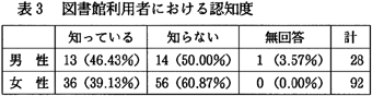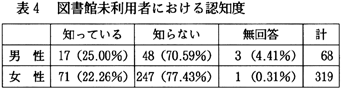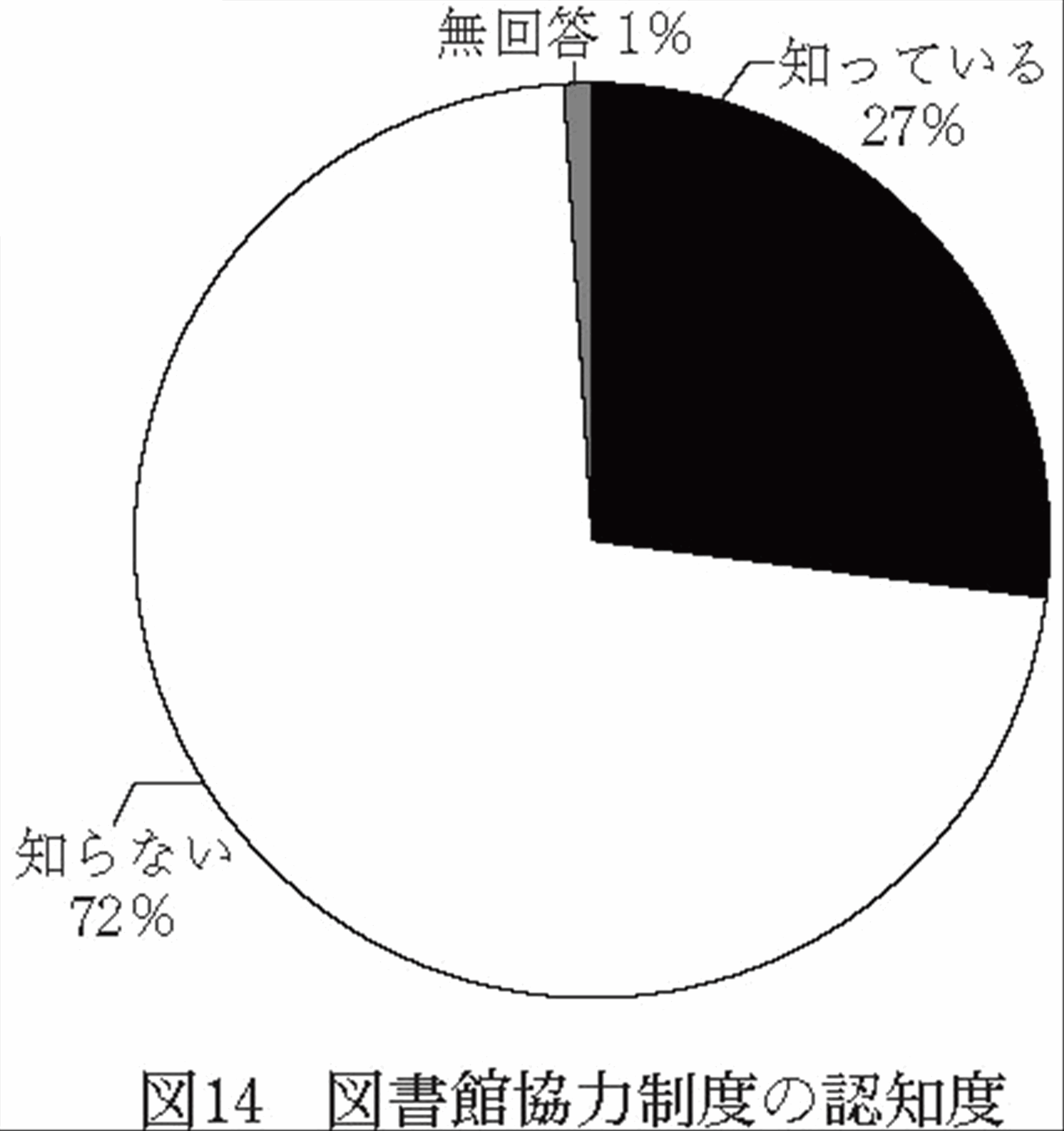 問10.(図書館協力制度の認知度)穴吹町立図書館を通して、県立図書館やその他の公共図書館の本を利用できることを知っていますか 分析:表3、4は、問6での回答を元に、図書館の利用者・未利用者を分け、それぞれのなかで男女別に回答の割合を出している。また、図14はすべての回答に対する割合を元に作成した。この設問は、本年初めて行ったものであるため、他の町村との比較ができないが、意外に広く知られているといえよう。県立図書館は、協力車を運行し、約2週間に1便の割合で県内の公共図書館を巡回し、県立図書館の本を貸し出したり、他の図書館の本を運送している。今回の調査では、図書館利用者の約半数、図書館未利用者においても約4分の1がこの制度を認知していることがわかった。この制度の活用によって、図書館はさらに多様な資料を利用者に提供できることになる。PRを続けて、より多くの人にこの制度を知らせてほしい。