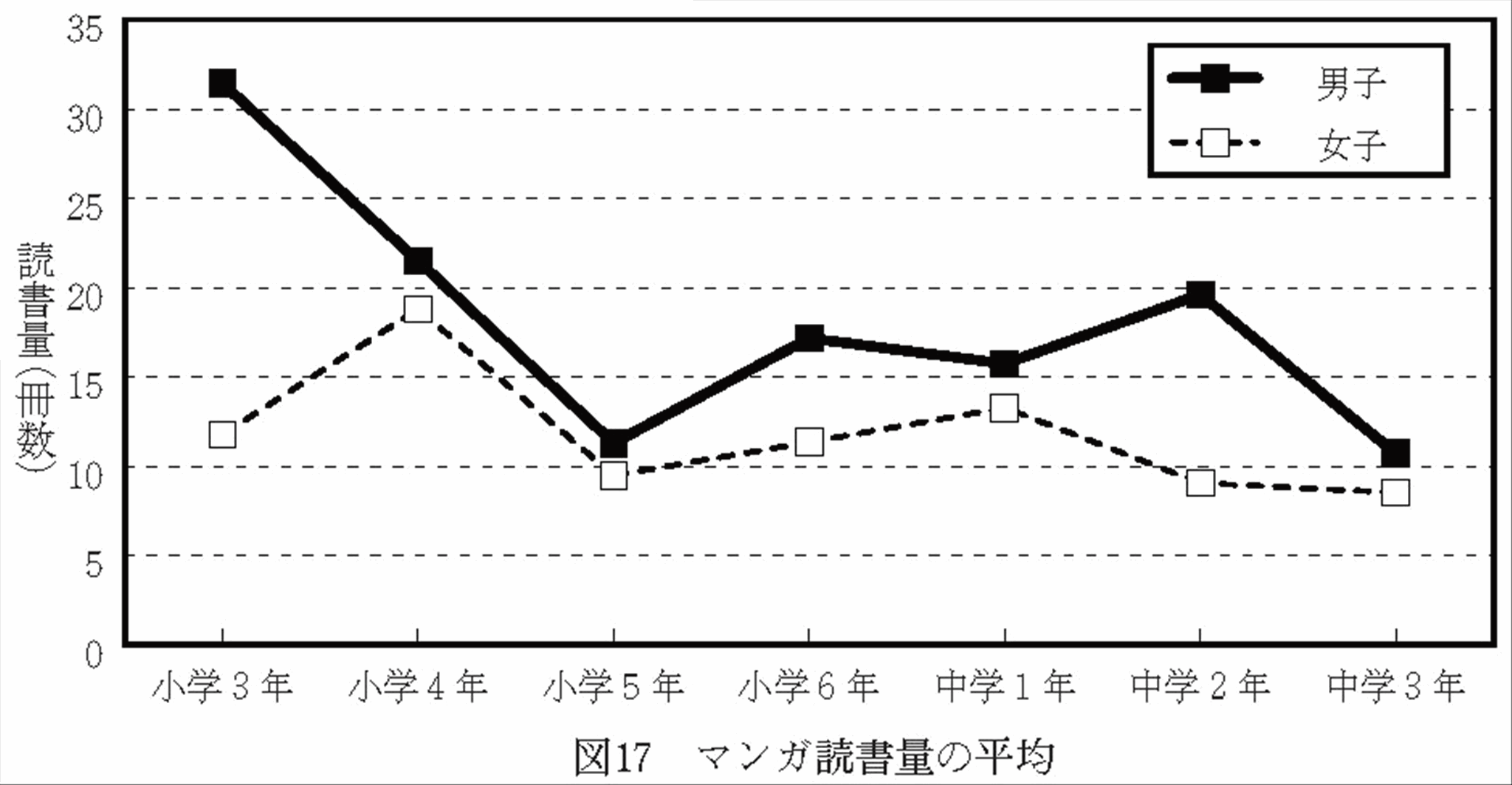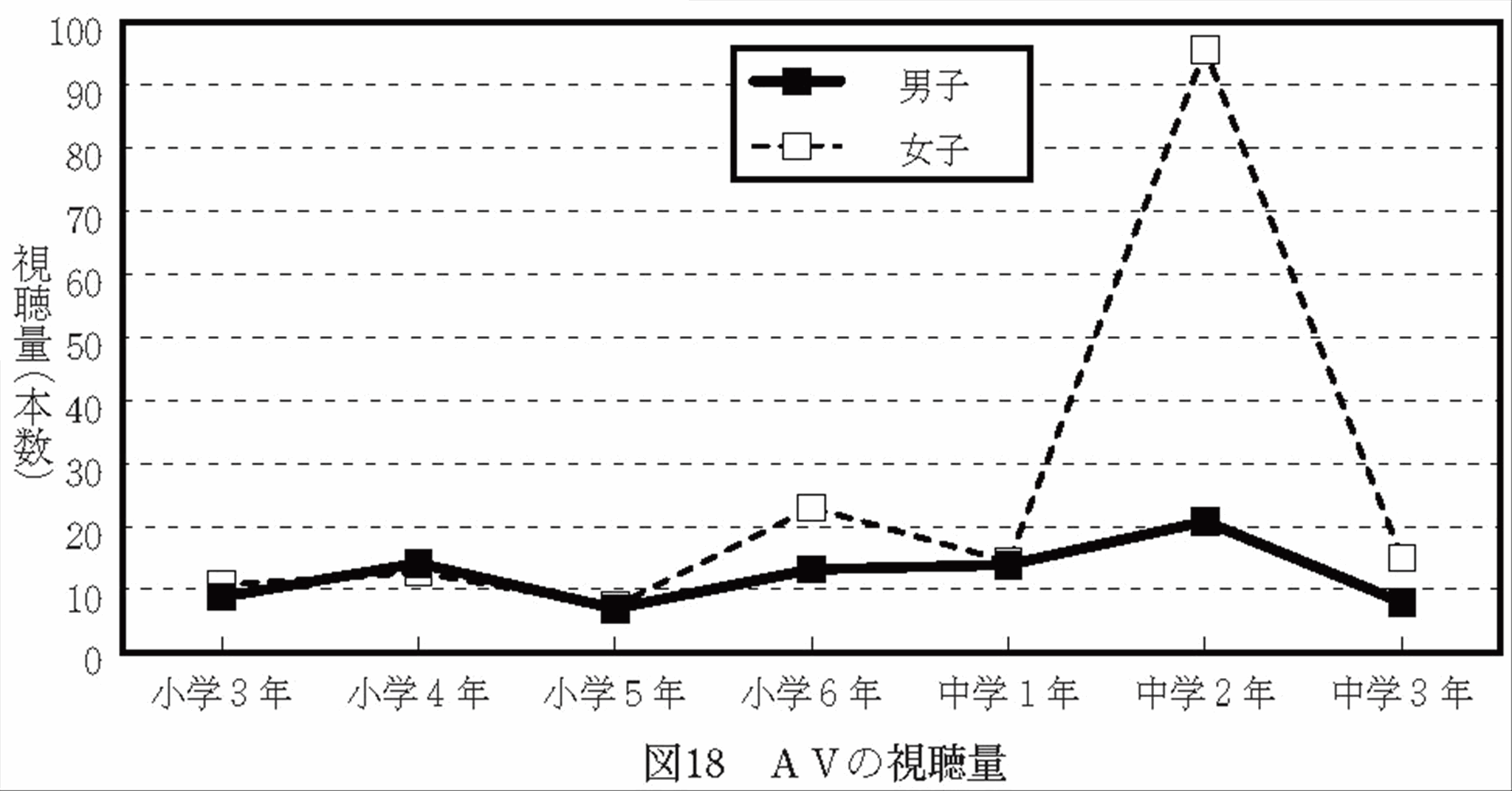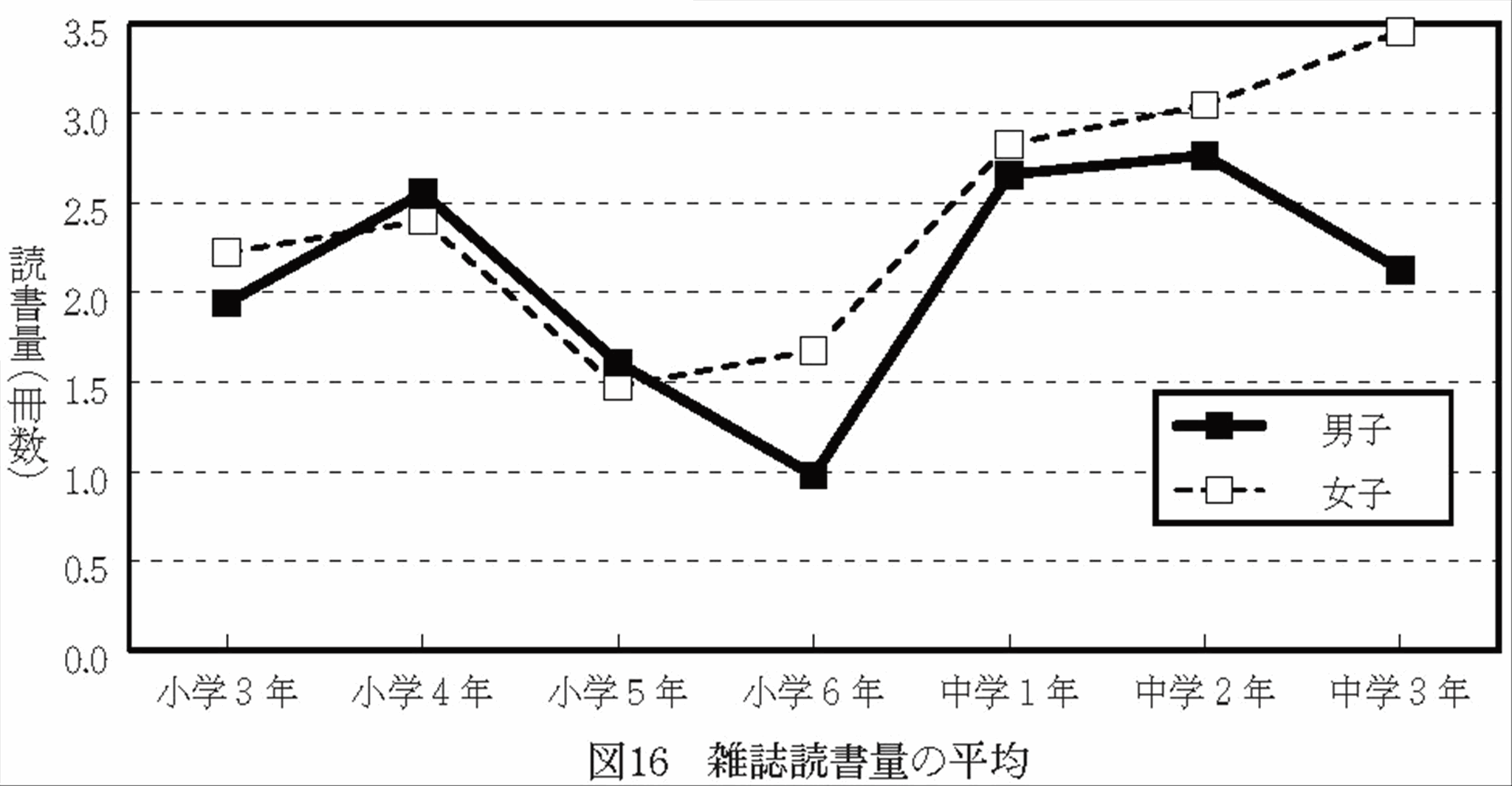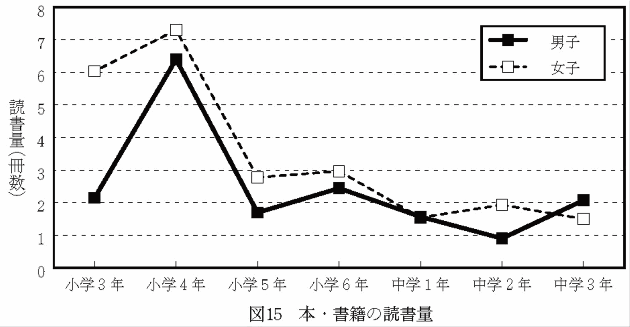問1.あなたは、6月1か月の間に、本を何冊読みましたか。(マンガやざっしは除く) 問2.あなたは、6月1か月の間に、雑誌を何冊読みましたか。(マンガざっしは除く) 問3.あなたは、6月1か月の間に、マンガ(マンガざっし、コミックなど)を何冊読みましたか。 問4.あなたは、6月1か月の間に、カセット・AV・ビデオなどをいくつ見たり聞いたりしましたか。 マンガ・雑誌を除く本の読書量は学年が進むにつれて減少する傾向が見られる(図15)。雑誌の場合は、中学1年の時期に急増しているのが特徴的である(図16)。また、マンガについては、他の書籍や雑誌に比べて、平均読書量がどの学年においても多くなっている(図17)。また、AVの視聴量は、中学2年女子の視聴量が飛び抜けて多いが(図18)、1,000以上の回答が2件あったためで、それを除くと約56.3になる。