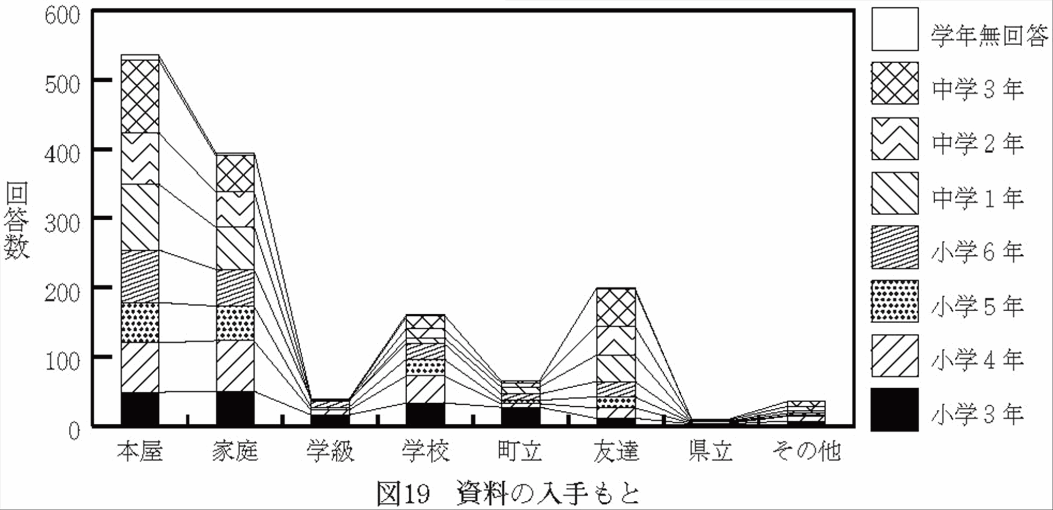 問5.(資料の入手もとについて)あなたは、本やざっしをどのようにして、かりたり買ったりしていますか。いくつでも○をつけてください。 最大の入手もとは、小学生では家庭、中学生では本屋であった(図19)。また、小学生ではどの学年も3位に学校となっているが、中学生はどの学年も友達が(図9)となる。特に、中学生になると学校という回答が激減している。 なお、その他、「兄・姉などの親類縁者」(8)、「脇町立図書館」(5)、「古本屋」(4)等の回答もあった。