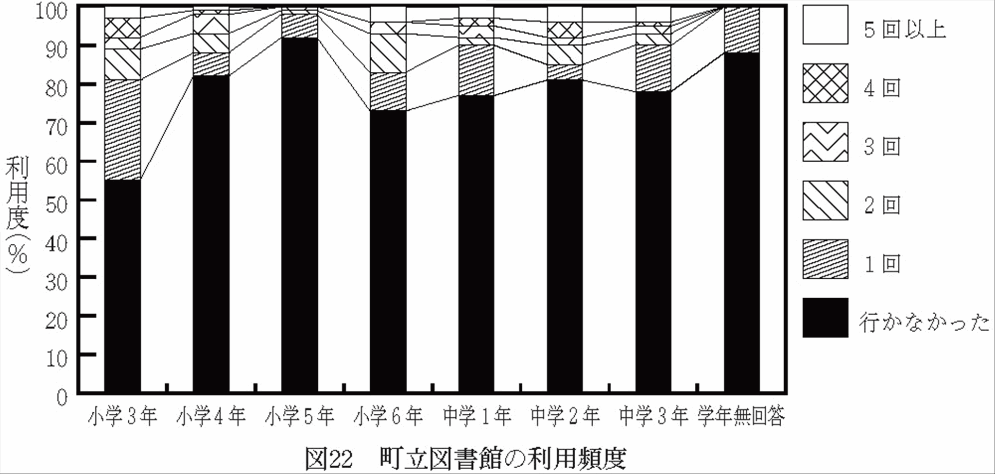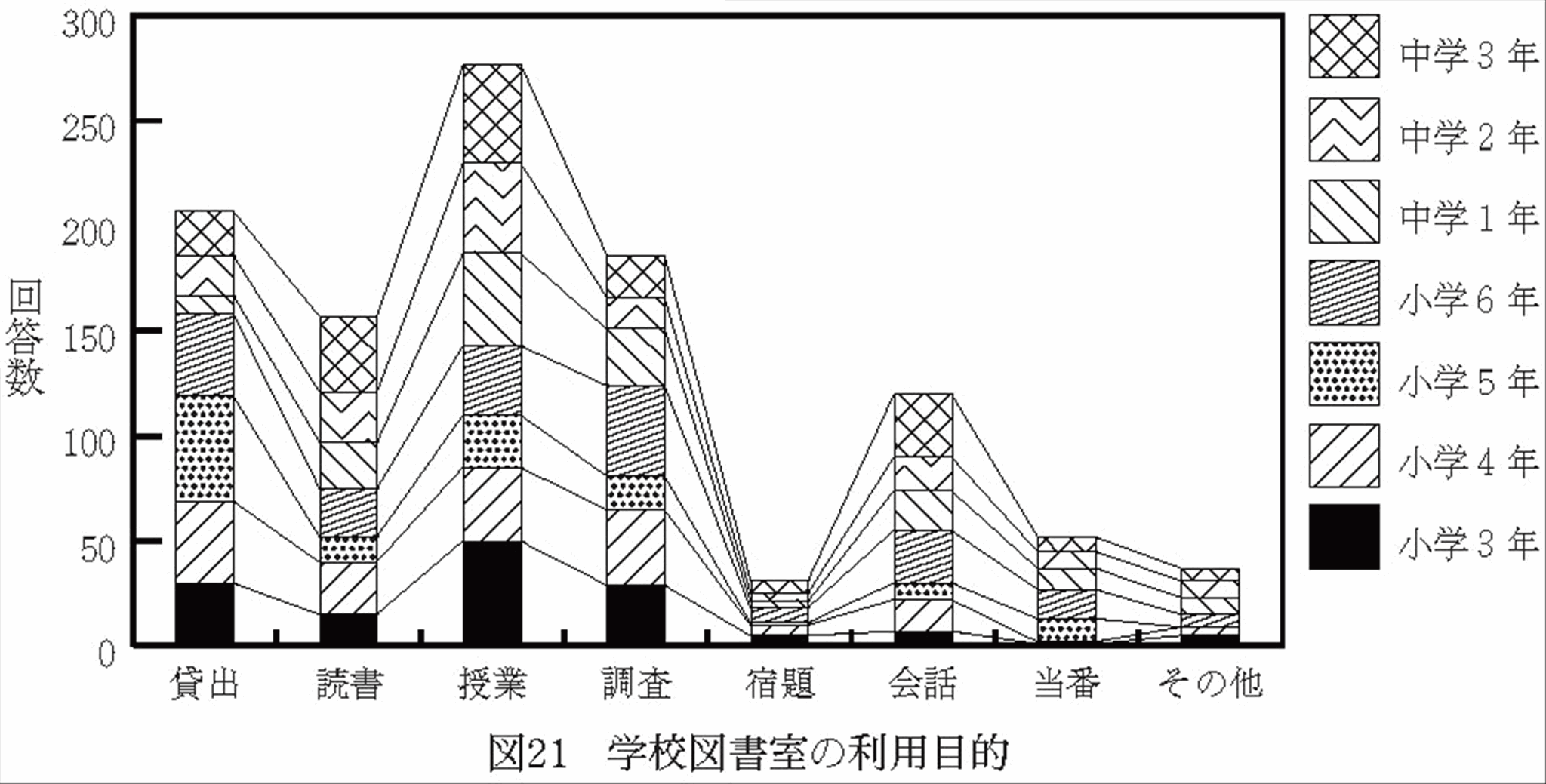 問6.(学校図書館の利用頻度について)6月1か月の間に、学校の図書室に行きましたか。1つだけに○をつけてください。 小・中学校、どの学年とも5回以上行ったという割合が多くなっている(図20)。特に中学3年の利用が多くなっているのが注目される。