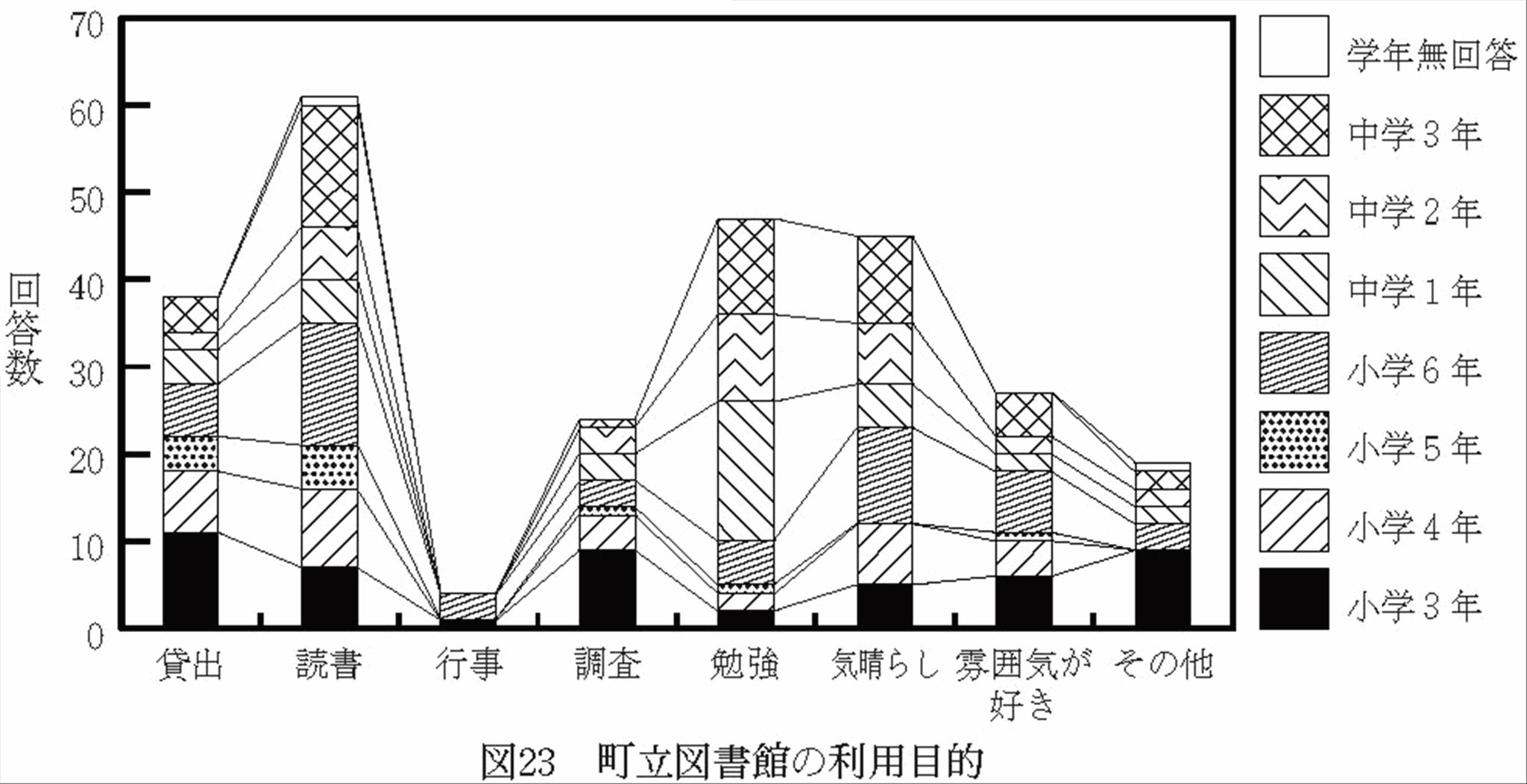 問9.(町立図書館の利用目的について)穴吹町立図書館に行った人だけにお聞きします。図書館は何のために行きましたか。いくつでも○をつけてください。 小学校においては、おおむね貸出や読書という回答が多いが、中学になると一変して勉強という回答が上位の座を占める。勉強という回答が全体で2位となっている。現在の公共図書館の在り方からすると好ましいことではない。 その他の回答として、「図書館見学」(6)、「涼みに」(5)等があった。
