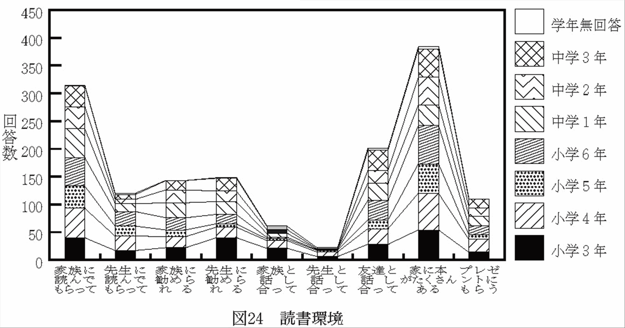 問10.(読書環境について)つぎのことがらについて、あてはまるものがあればいくつでも○をつけてください。なければつけなくてもかまいません。 小・中どの学年においても、1位が家に本がたくさんある、2位が家族に読んでもらって、となっている。家庭での読書環境はかなり恵まれている様である。