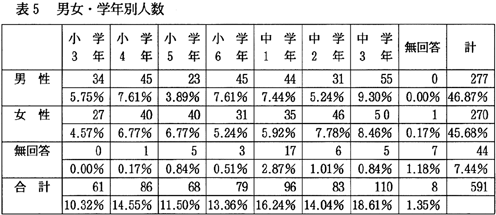 2)小学3年生から中学生対象 このアンケートは、穴吹町内の小・中学校に御協力をいただき、小学3年生から中学3年生の全員に対して行い、591人から回答を得た(表5)。以下にその分析を行う。